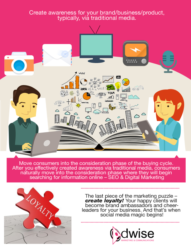- Move consumers into the consideration phase of the buying cycle. After you effectively created awareness via traditional media, potential customers naturally move into the consideration phase where they will begin searching for information online – SEO & Digital Marketing.